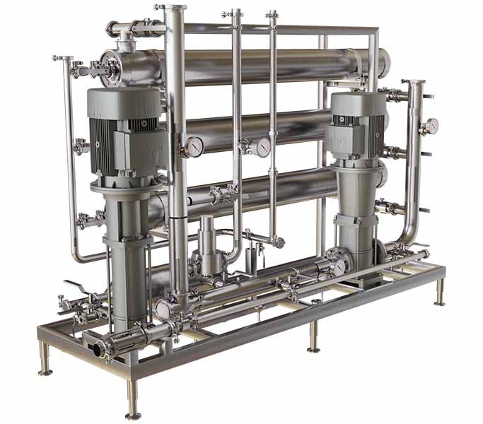 An industrial reverse osmosis (RO) system is a pressure-driven membrane filtration technology used to separate water and low-molecular-weight solutes from valuable products. In product processing, RO works by forcing liquid feed through semi-permeable membranes that retain larger molecules (like sugars, proteins, nutraceuticals, salts or bioactive compounds) while allowing water to pass through.
